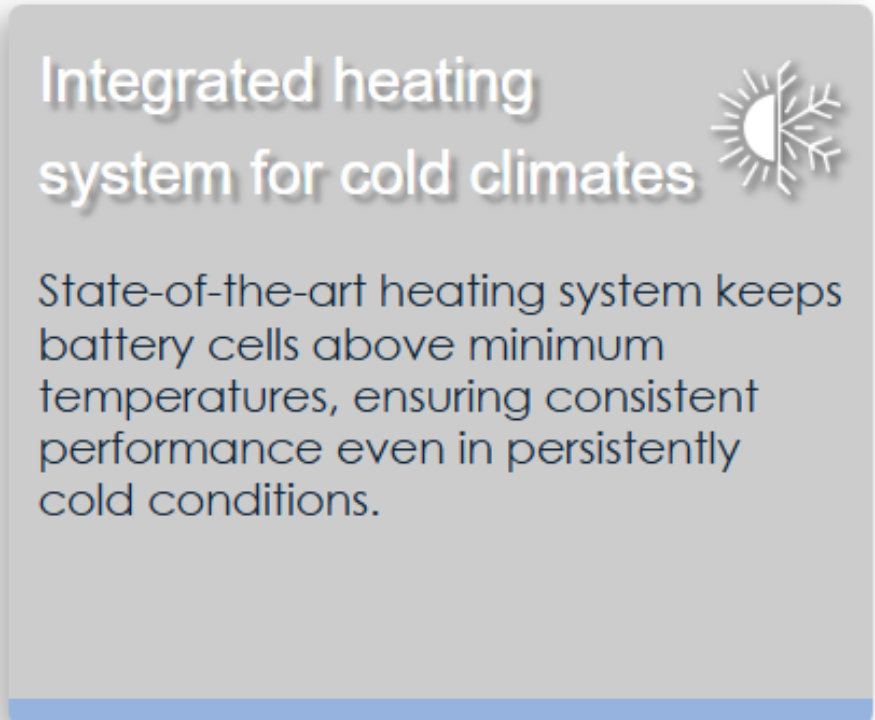- State-of-the-art heating system keeps battery cells above minimum temperatures, ensuring consistent performance even in persistently
